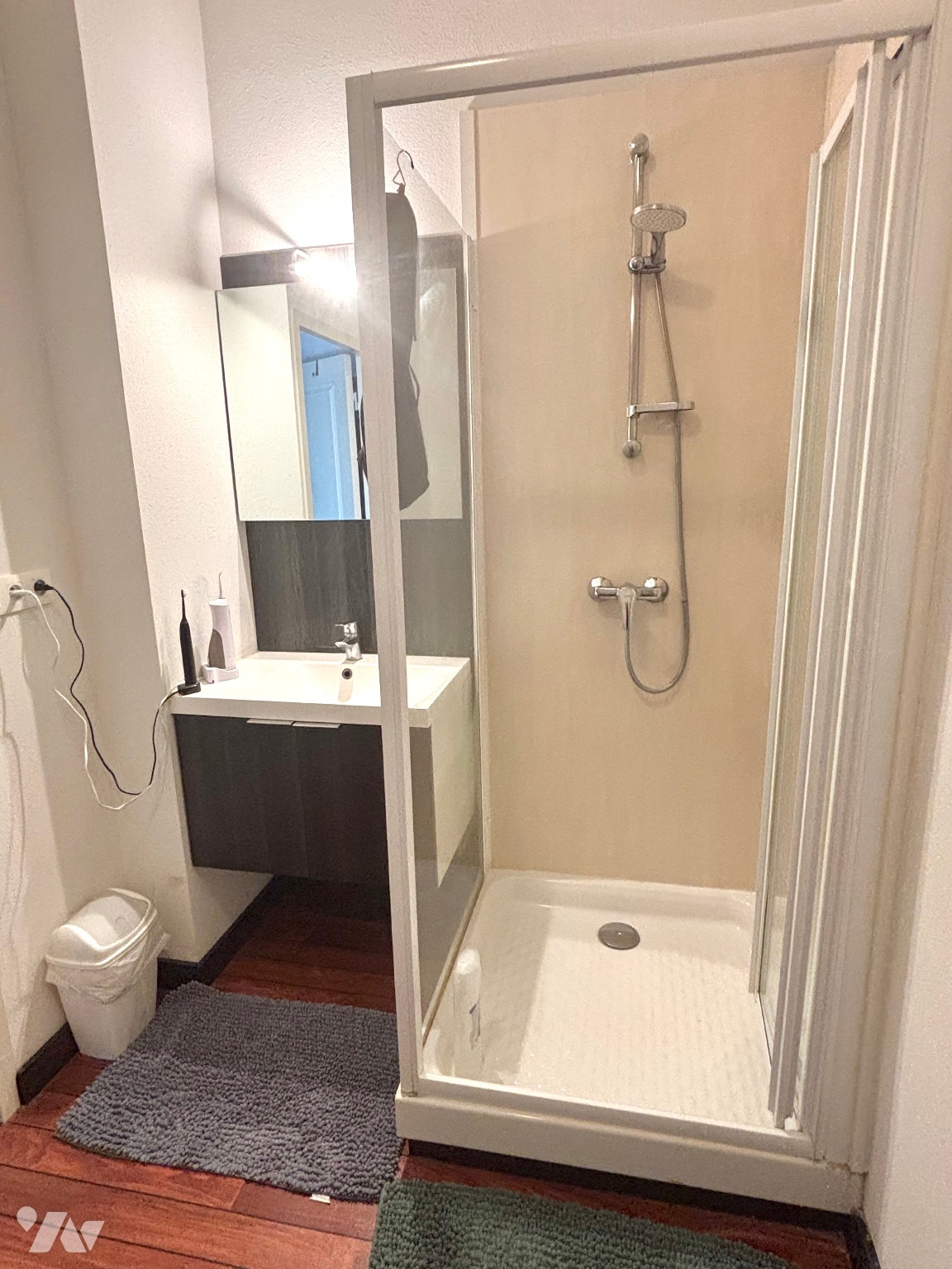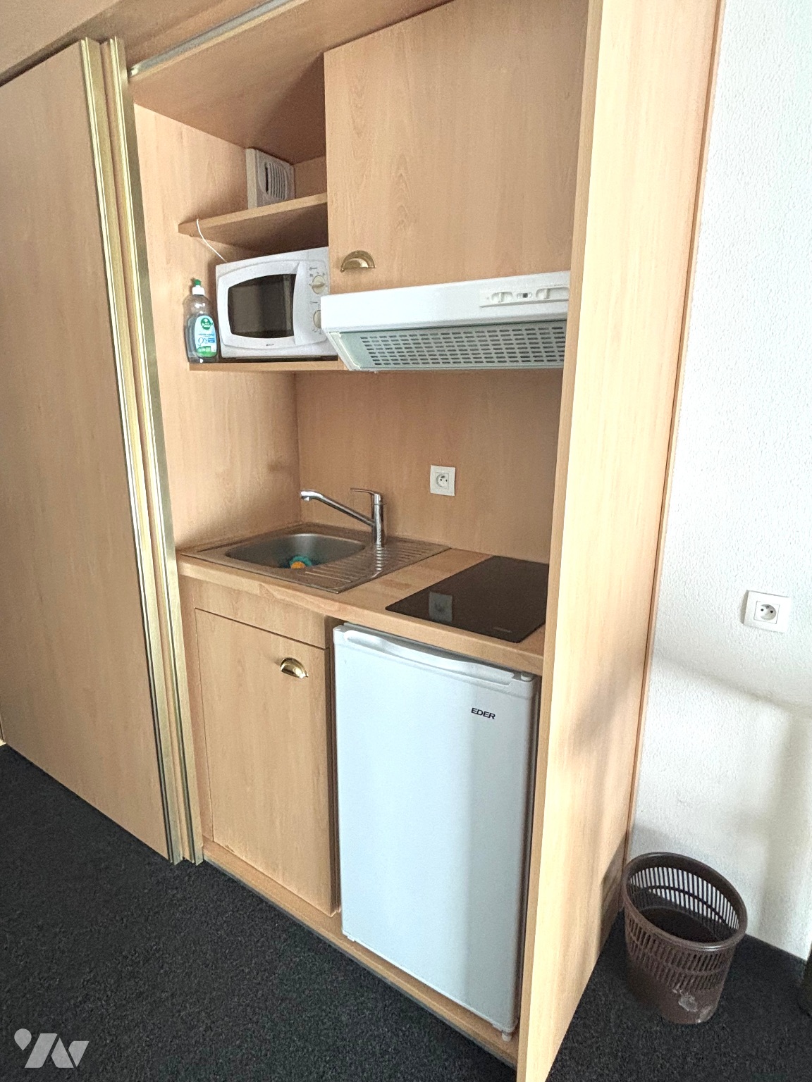 Au deuxième (sans ascenseur) : entrée avec placards-penderie et kitchenette intégrée équipée (évier, rangements, réfrigérateur, plaques vitro, hotte, micro-ondes), pièce de vie 23m² (baie vitrée sur balcon), salle d’eau aménagée avec WC